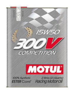 Óleo de competição 100% sintético baseado na tecnologia ESTER Core®. Através de parcerias técnicas com as mais prestigiadas Equipes de competição automobilística, a MOTUL desenvolveu uma ampla gama de lubrificantes para Competição e Carros Esportivos. A linha 300V Motorsport melhora a potência dos motores de última geração juntamente com alta proteção contra o desgaste, queda da pressão de óleo e oxidação devido a alta temperatura. Potência do motor e confiabilidade. Consegue compensar uma diluição de combustível média no óleo. Tipo de uso: Corridas de curta distância - Rally - GT.